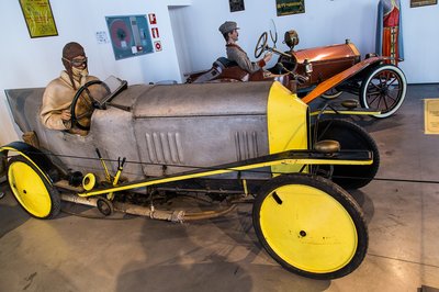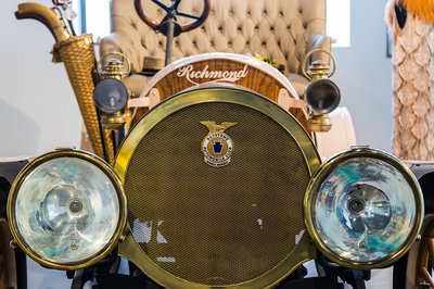 Bamba tekintetű amerikai Richmond 1908-ból. Vastag bőrből készült kanapéról lehetett tekerni a lakkozott fakormányt, fonott esernyőtartóval az oldalunkon.