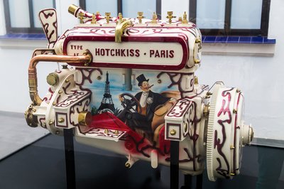 Hotchkiss motorblokk, mint festővászon. A hetvenes évek elejére teljesen eltűnt márkát egy amerikai fegyverkovács alapította Franciaországban, egészen 1954-ig gyártottak autókat, amikor a konkurens Delahaye felvásárolta a céget. Hotchkissekkel nyertek nem