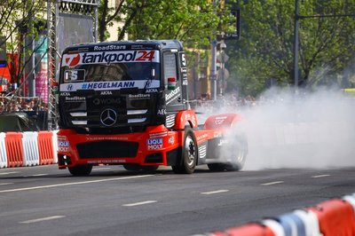 Az ilyen bulikból kétszeres Európa bajnokunk, Kiss Norbi sem maradhat ki. Mercedes versenykamionjával a fél utcát és a teljes közvetítő stábot vastag gumifüstbe csomagolta.