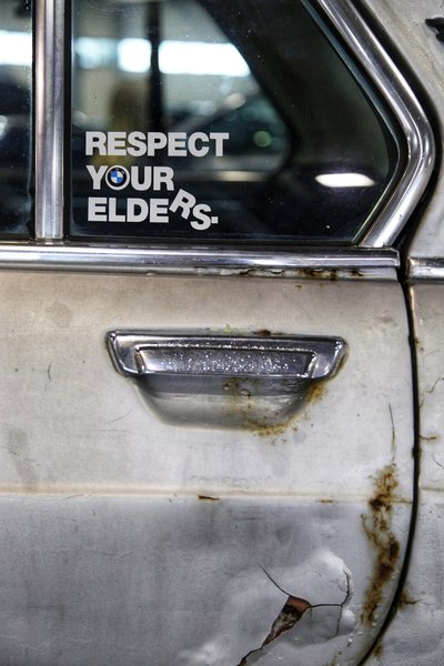 Ezen az öreg BMW-n pont minden látszik, csak a tisztelet nem, bár a patkány stílushoz mesésen passzol, humornak sincs híján