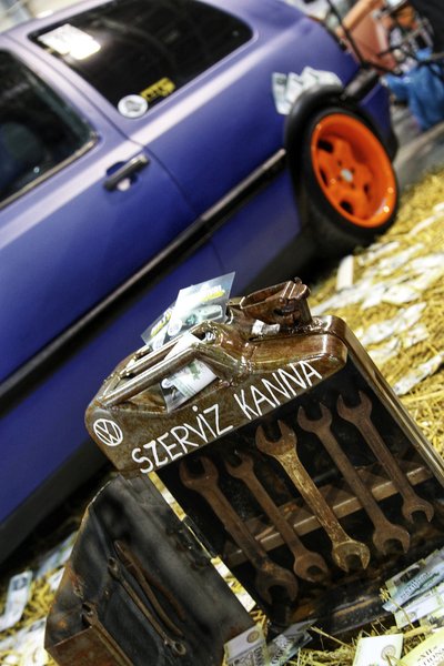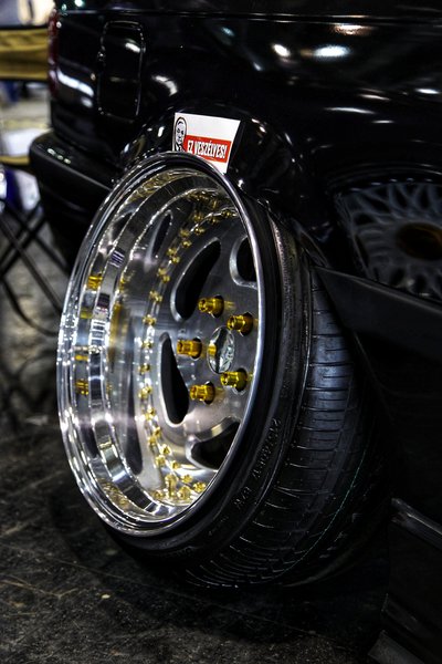 Ez veszélyes! A standok tele vannak az ehhez hasonló módon ültetett autókkal, ám ez a felni és gumi közé feszülő sárvédőív tényleg nélkülözi a józan észt, poénnak viszont állat