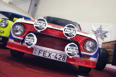 Klasszikus és modern versenyautókból sincs hiány, itt egy gyönyörű állapotú Skoda a full retro Hella lámpasorral