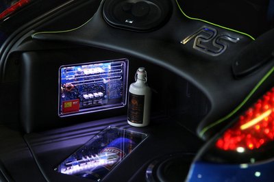 Ford Focus RS látványos és szépen kidolgozott csomagtéri installációja, plexi mögül kelleti magát az erősítő és a NOS tartály is