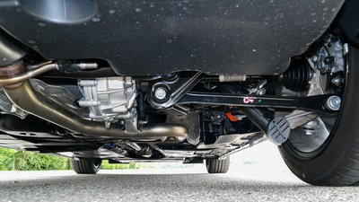 A hibrid hátsó futóműve az egyetlen komoly konstrukció, de ez sem menti meg a rugózási komfortot. Középen a hátsó villanymotort látjuk