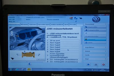 A vezetett diagnosztika dokumnetumtárából minden lényeges adat megjeleníthető, aktívan segíti a hibakeresést. Itt a műszerfal csatlakozó lábkiosztása látható