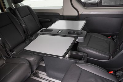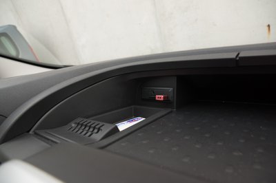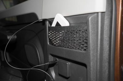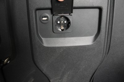 A hátsó USB csak tölt. Mellette egy 230V-os csatlakozó, a fehér tárgy pedig egy mobil router a teljes mobilitásért. Egyes modellekben ezért több százezer forintot kérnének el.