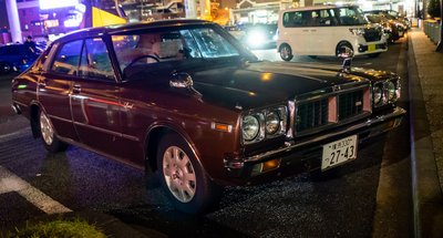Nissan Laurel a hetvenes évek végéről, ocsmány dísztárcsákkal. Pont ilyen, ráadásul ilyen színű szolgálati autónk volt Japánban három és fél éven át