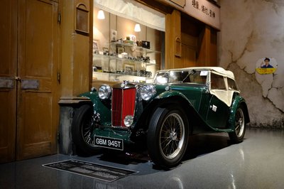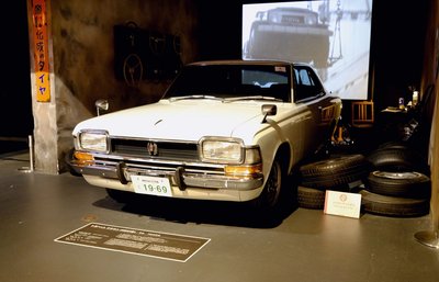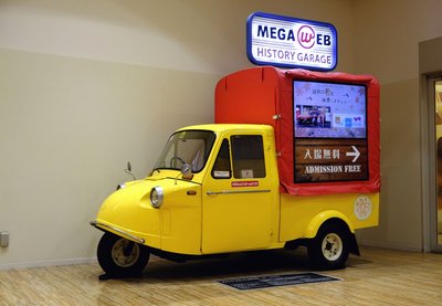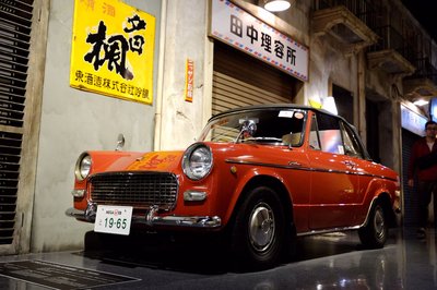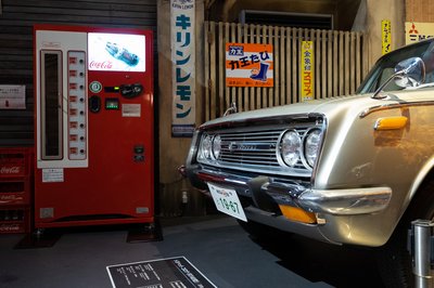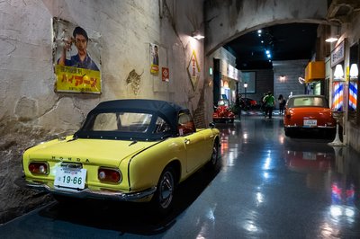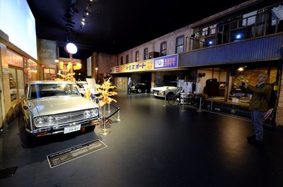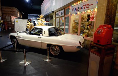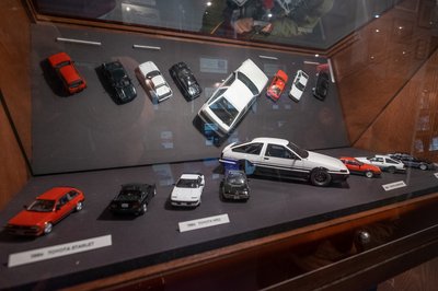 AE86 életnagyságban, méghozzá a Trueno-kivitel. Fölötte vetítés zajlik, japáni, érdekesautós utcaképekkel különféle szériákban - 50-es évek, 60-es évek, 70-es évek. Itt is el lehet ücsörögni egy órát. Az 1959-ben készült képen egy diplomata, háromszemű Ta