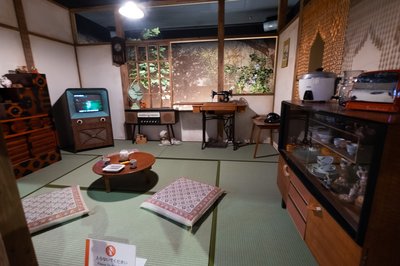 Japán lakásbelső a hatvanas évek elejéről. Tatami a padló, épp csak pár bútor, térdelőpárna, rövid lábú asztal, rizspapír falak - oké, ez többnyire ma is ilyen, pláne vidéken. De ott a színes, kis képcsöves tévé, a kenyérpirító, a mjúzik center, a rizsfőz