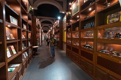 Csak ebben a csarnokban el lehet tölteni két órát. Jobboldalt a modellvitrinek, kilométer hosszan, baloldalt a szak-, típusbúvár-könyvek, magazinok és katalógusok - persze itt minden az autóról szól