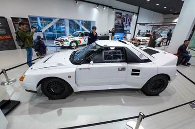 Toyota-raliautók terme. Ez itt egy felismerhetetlenségig átalakított MR2-es, amúgy négykerékhajtásos, és a B csoportot helyettesítő, leendő S csoport előírásainak megfelelve készült. Ami nem lett