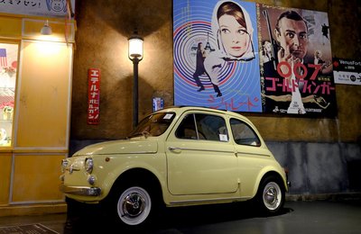A Fiat 500 összes szériáját keverni szokták a kívülállók, de ezt itt nem szúrták el. 1960-65 között gyártott 500D (ez konkrétan 1962-es), még a libakergetős változat, fölötte stimmelő filmplakátok. Audrey Hepburn (A lány, aki ellopta az Eiffel-tornyot), S