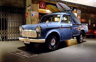 Datsun 1000 pickup 1960-ból, meglehetősen kaliforniaias öltözetben, két szörfdeszkával. De hiteles, mert a japánok is űzik a sportot. A csúcssebességnél se kellett túl erősen lekötözni a deszkákat, mert a kisteher csak 90-et ment