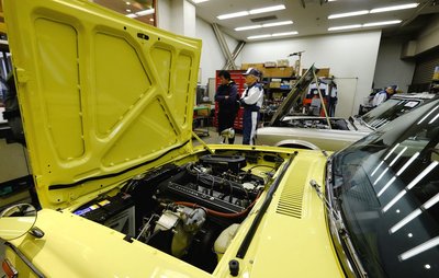 Ez meg itt a múzeumhoz tartozó restaurátorrészleg. Üveg mögött dolgoznak a szaki bácsik; elég nyomasztó lehet, ahogy állandóan bámulják az embert, odakintről. Boncasztalon egy Mercedes Pagoda és egy Toyota Corona kupé