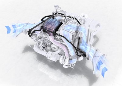 Az egyik oldalon a motor szívja a friss levegőt, a másik oldalon a vizes töltőlevegő hűtő vízhűtője kapja a friss levegőt