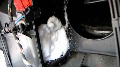 Célszerű közvetlenül az elpárologtatóra fújni a habot, ezt kell megtisztítani, leginkább erre rakódik rá a szennyeződés