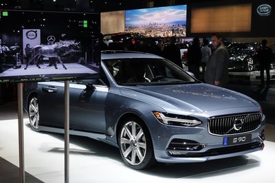 Sok újdonság nem volt a Volvo-standon, de egy kicsit már a régmúltba mutató, de még mindig működő fricskát azért elhelyeztek: úgy rakták ki az S90-est, hogy orral a Mercedes-stand felé álljon. Az installáció a 360 fokos kamerarendszert promotálta, s az or