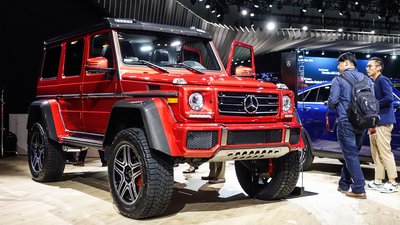 Mercedes-Benz G550 4x4², az erősen orosz oligarchás ízlésre hangolt, vadiúj veterán-Merci az amerikaiaknak, 43 centis hasmagassággal, szuper-erdészeknek, virtuálhegymászóknak és olyanoknak, akik sokat szerelik az autójukat, de nincs emelőjük és aknájuk.