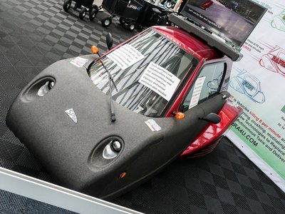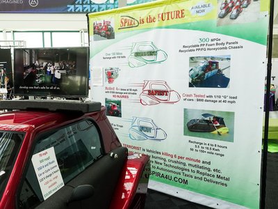 Őrült vagy vizionárius? Talán inkább az előbbi. Egy csávó az LA Auto Show előcsarnokában csapott le ránk, állítólag multimilliomos, s a pénzét különféle jövőbe mutató cuccokba fekteti, többek között ebbe a Spira nevű, apró, biztonsági autóba