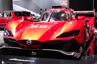 Mazda RT-24P versenyautó a 2017-es daytonai prototípus-futamokra. Rajta a Mazda arculati maszkja, hátuljában az MZ2.0-T kétliteres, közvetlen befecskendezéses, négyhengeres, turbós benzinmotor, most 600 lóerővel