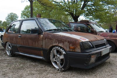 Ezt a Daihatsut már le sem fotózom, mondtam. Ez egy Swift - így Toci. Felhívnám a figyelmet a felnire és a kerékméretre. Ha a virslinek vannak fokozatai, akkor ez frankfurti