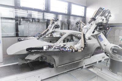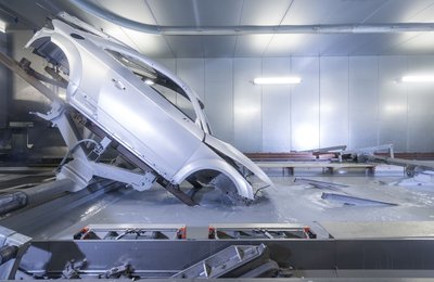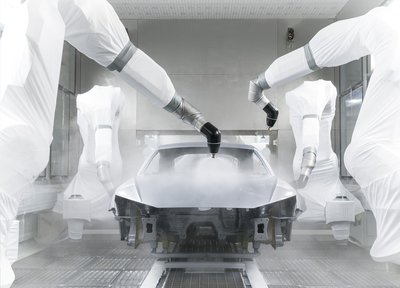 A robotok határozottan jól öltözöttek. Itt 10-15 mikronnyi réteget visznek föl, a lakkozás végére összesen 100 mikron lesz a rétegvastagság
