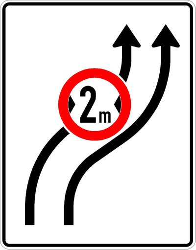 Sokfelé találkozni az ilyen terelő és a belső sávra vonatkozó szélességkorlátozást jelző táblával