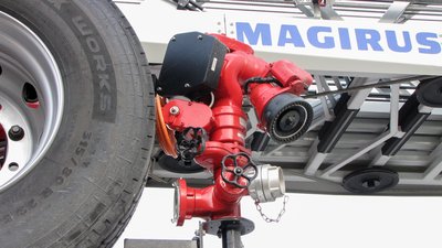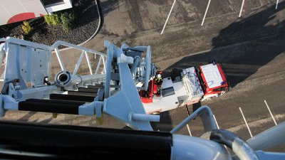 A mentőkosárra szerelhető vízágyú nincs fixen rögzítve, amikor nem kell, itt, a létra lábánál tárolják