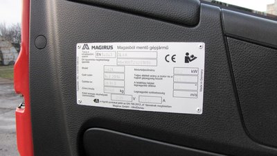 A magasból mentő szer gyári adattáblája. A gyári számot és a gyártás évét felcserélték, de a lényegen nem változtat