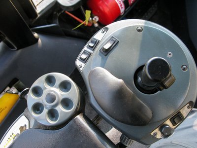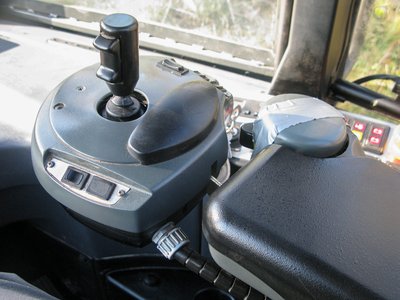 A baloldali karfa. A joystick a darut irányítja, a kis tárcsa a „finom kormány”