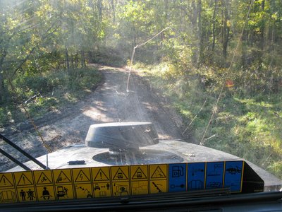 Kissé csálén áll a kipufogó, nemrég ráesett egy fatörzs. Kemény az erdei élet