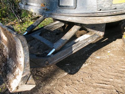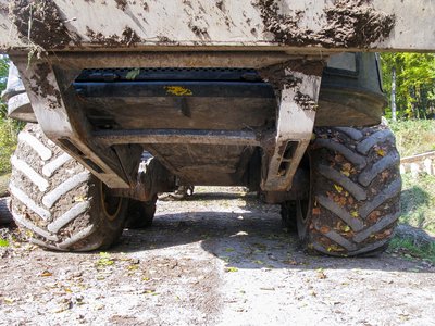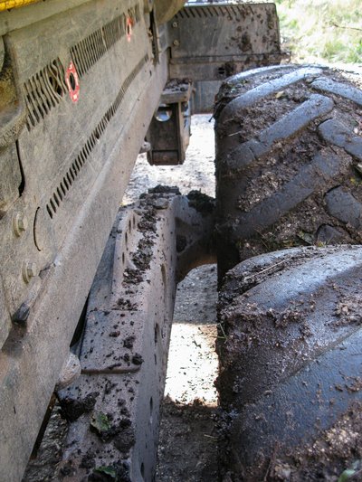 A hátsó kerék alá került egy fatörzs, de a gép simán átlép rajta, nem is érezni