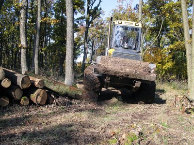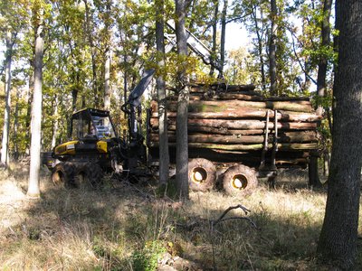 Kiért a Buffalo az erdészeti aszfaltútra, innen már teherautó viszi tovább a fát
