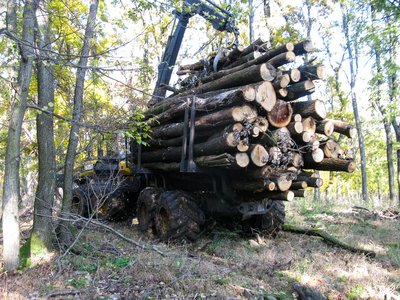 A lerakodott fatörzsekét rakoncás, gólyadarus tehergépkocsi jön majd