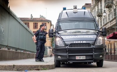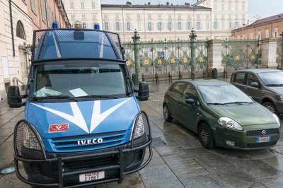 Csendőr-Iveco a torinói királyi palota előtt. Torino távolról sem a világ legjobb városa. Olasz viszonylatban meg aztán tényleg különösen sivár. Építészetileg messze kevésbé érdekes, mint Olaszország többi része, és olyan az egész, amilyen Magyarország le