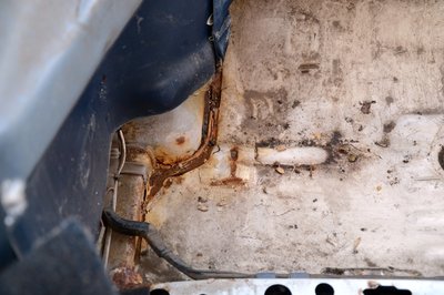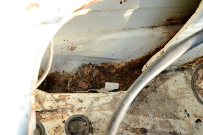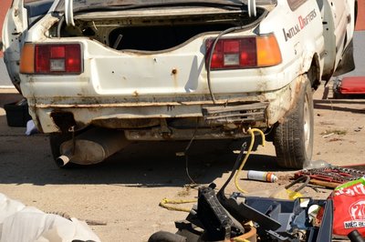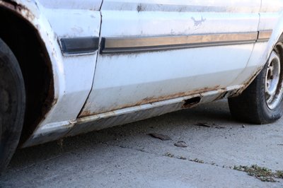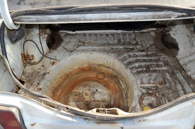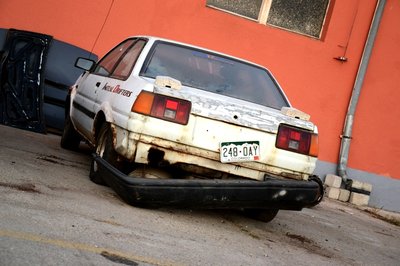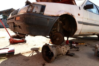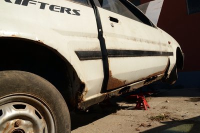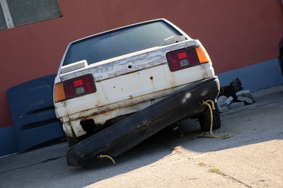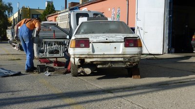 A bal oldali lökhárító-bakkal nem kellett bajlódni, kirohadt. A téglák lenyomják a zsanérokat, a csomagtérfedél még csak dísznek van rápakolva