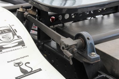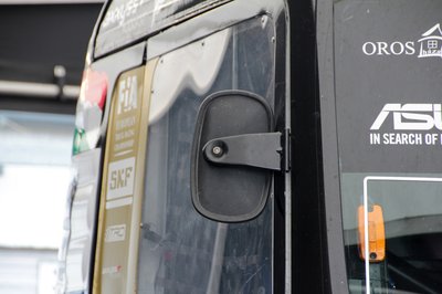 Kamionos léptékekben ez egy apró versenytükör, de még így is kéttenyérnyi. A bukócsőre a kötelező irányjelzőt szerelték