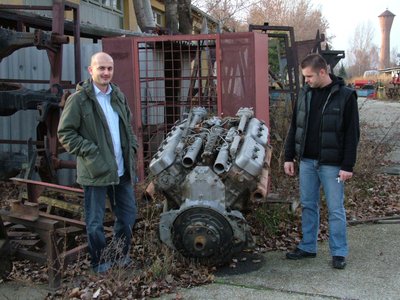 Belaz dömper V12-es 22 literes dízele, a méretarány kedvéért Perlaki István üzletkötővel és Horváth András szervizvezetővel