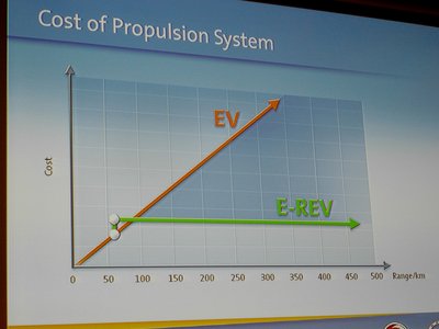 A hajtásrendszer ára a hatótávolság függvényében. A zöld a range extenderes jármű zsenialitását mutatja