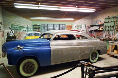 Egy átépítő-műhely atmoszféráját idéző installációban áll ez az 1950-es Mercury, amelyen jól megfigyelhetők az átalakított részletek. A tetőt laposabbra vágták, a krómozott díszléceket eltávolították, a karosszérián az eredetitől eltérő oldalvonalat alakí