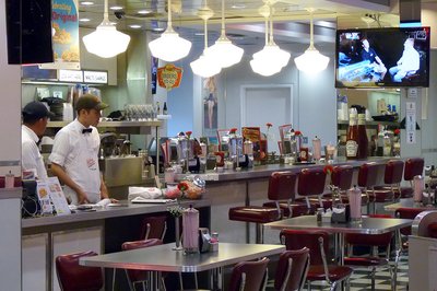 Az ötvenes évek stílusában berendezett büfé a Petersen múzeum épületében, ahol még számos szolgáltatás teszi színesebbé az autók között töltött órákat. A nagy ajándékboltban a gyűjteményhez kapcsolódó emléktárgyakat, könyveket, ruhaneműt, autómodelleket l