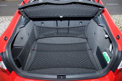 590 liter, hálók, kis rekeszek. A padló alatt teljes értékű pótkerék található