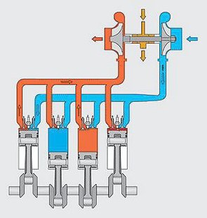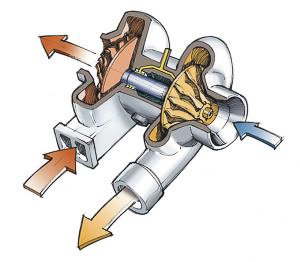 A piros kipufogógáz tekeri meg a tengelyt, hogy minél több kék friss levegő jusson be a motorba