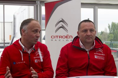 Xavier Mestelan-Pinon, a Citroen Racing műszaki igazgatója (balra) és Yves Matton csapatvezető a vasárnap reggeli sajtótájékoztatón. Két vérprofi, akik a rali-világbajnokságon már bajnokká tették a Citroent. Egyelőre úgy néz ki, ez a WTCC-ben is sikerül m