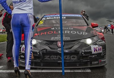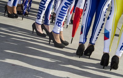 A Valvoline kék-fehérbe húzott hoszteszei állandó díszletei a WTCC-versenyeknek. A testhez simuló ruha most is kevés volt: a képen még a szombati napsütésben ácsorognak, majd vasárnap ismét áztak-fáztak szegény lányok.