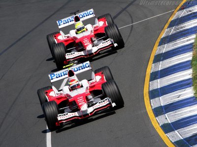 Jarno Trulli (elöl) háromszor, Ralf Schumacher kétszer állhatott fel a dobogóra 2005-ben, emellett egy-egy pole pozíciót is begyűjtöttek a TF105-tel