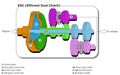 A DSG (EDC) előre bekészíti magának a következő fokozatot. Lényegében két váltóból áll - az egyik üresben jár, és készül a következő műveletre, a másik épp hajt