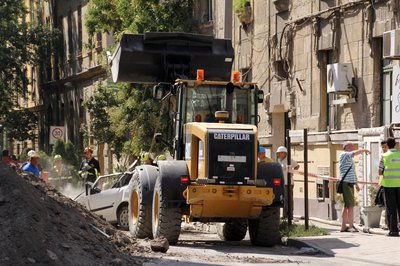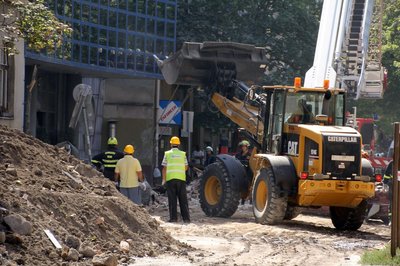 A markolós húzza ki a roncsokat a törmelék alól