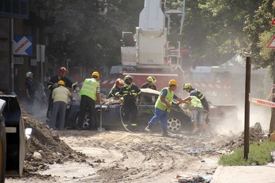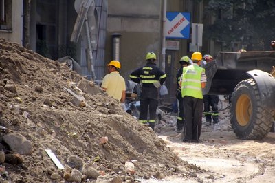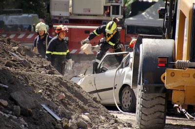 A tűzoltók szabadítják meg a roncsot a ráomlott tégláktól