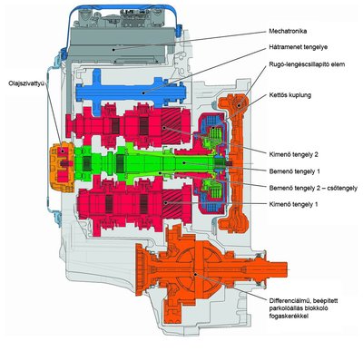 Ugyanez rajzon. Tulajdonképpen a bemenő tengely fölött és alatt egy-egy független sebességváltó van
